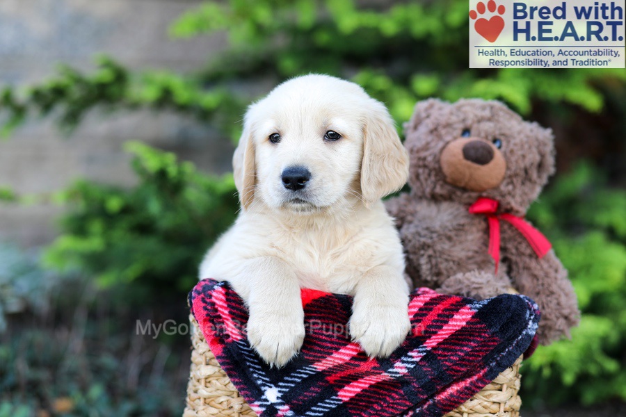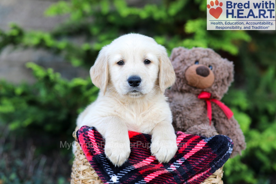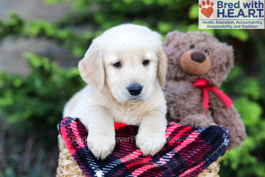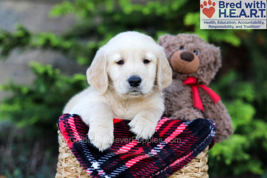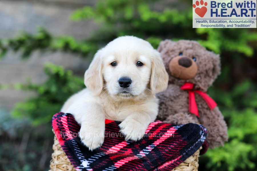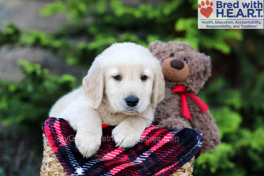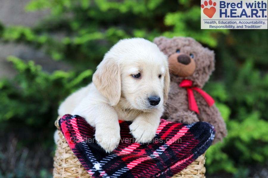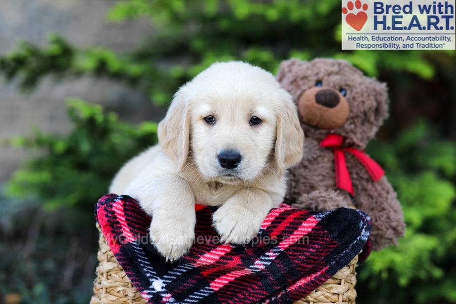 My sire Zeus is a beautiful medium colored golden, OFA Hip, Elbow, Heart, Patella, and Eye certified, and is genetically screened and clear. My mother Sally is a lovely golden with a gentle personality who is also OFA Hip (“excellent” rating!), Elbow, Patella and Heart certified and genetically screened. Both parents are here on the premises. I was raised with care in our loving family environment and have had Early Neurological Stimulation training from day 3 to 16 to encourage a stable temperament and adaptability to a new home.