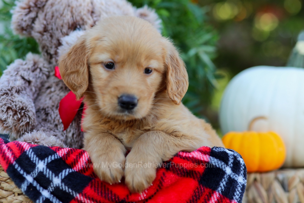 My sire Mooze is a medium golden color with a great personality and a more blocky head with OFA Hip, Elbow and Heart certifications. My mother Scarlet is a beautiful dark gold color with an outgoing and friendly personality who is also OFA Hip, Elbow, Heart and Patella certified. Both of my parents are also genetically health-tested and are here on the premises. I was raised with care in our loving family environment and have been ENS trained from day 3 to 16.
