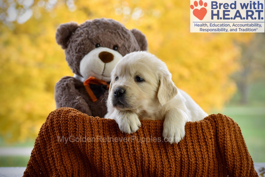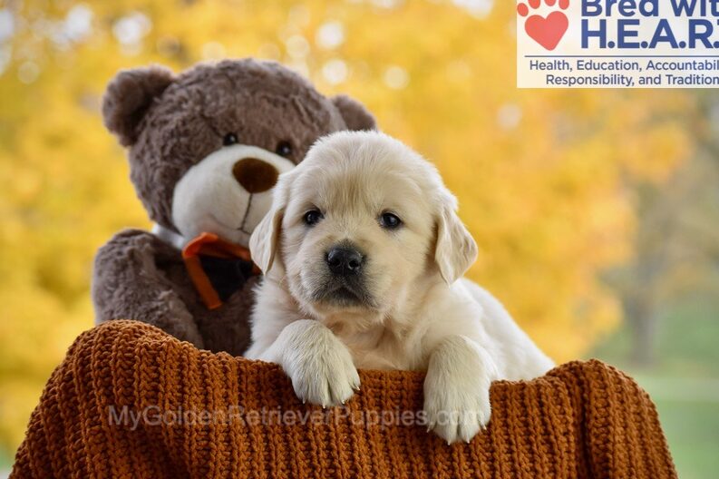 My sire Riley (“English Cream”) boasts the distinction of being the son of a champion, has a gorgeous coat, and friendly personality and is OFA Hip, Elbow, Heart and Patella certified. My mother Kenzi is a friendly, sweet cream/light Golden (European father, American mother) who is also OFA Hip, Elbow, Heart and Patella certified. Both of my parents have been DNA health-tested to be sure I am free of common genetic disease.