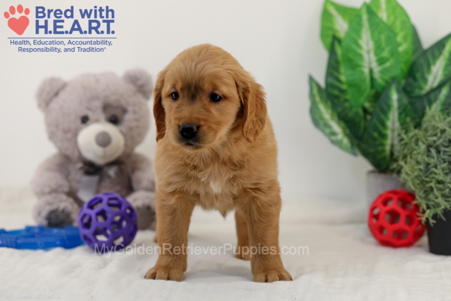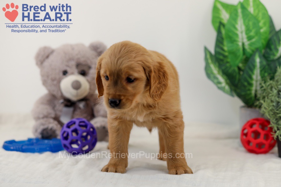 My sire Montae is a poised dark Golden with OFA Hip (prelim), Elbow (prelim), Patella and Heart certifications. My mother Ruby is a beautiful lighter golden color and is also OFA Hip, Elbow, Patella and Heart certified. Both parents are DNA health-tested and are here on the premises.