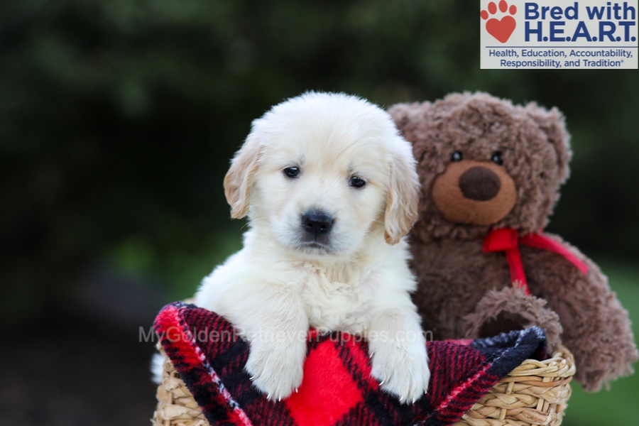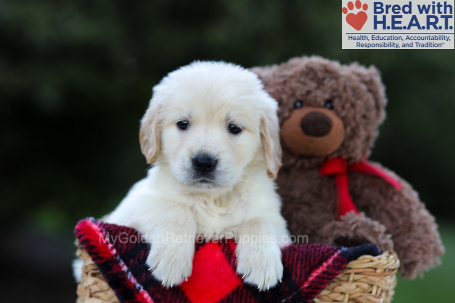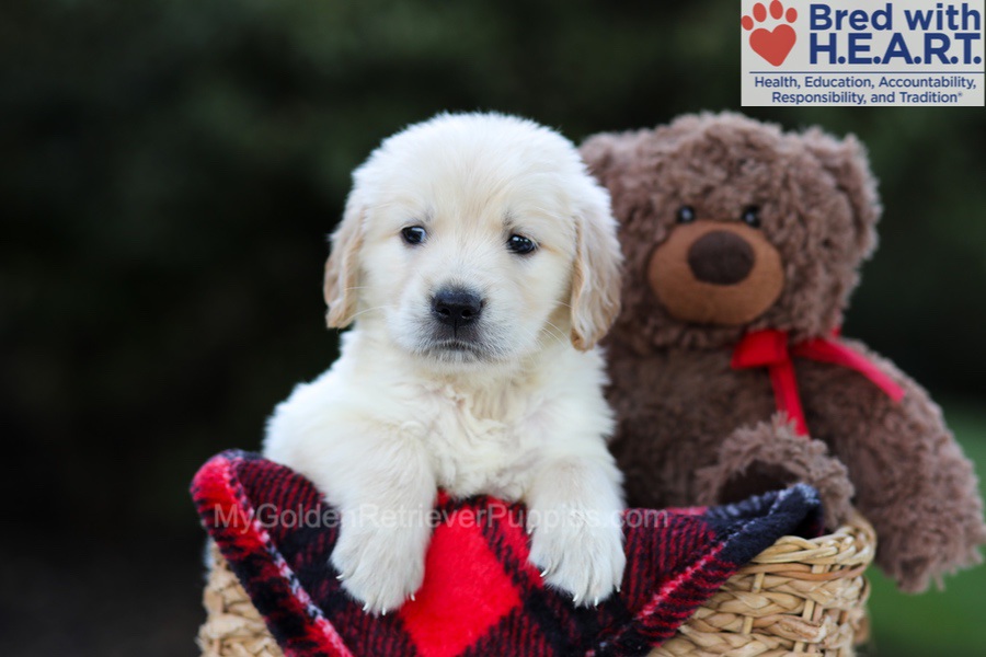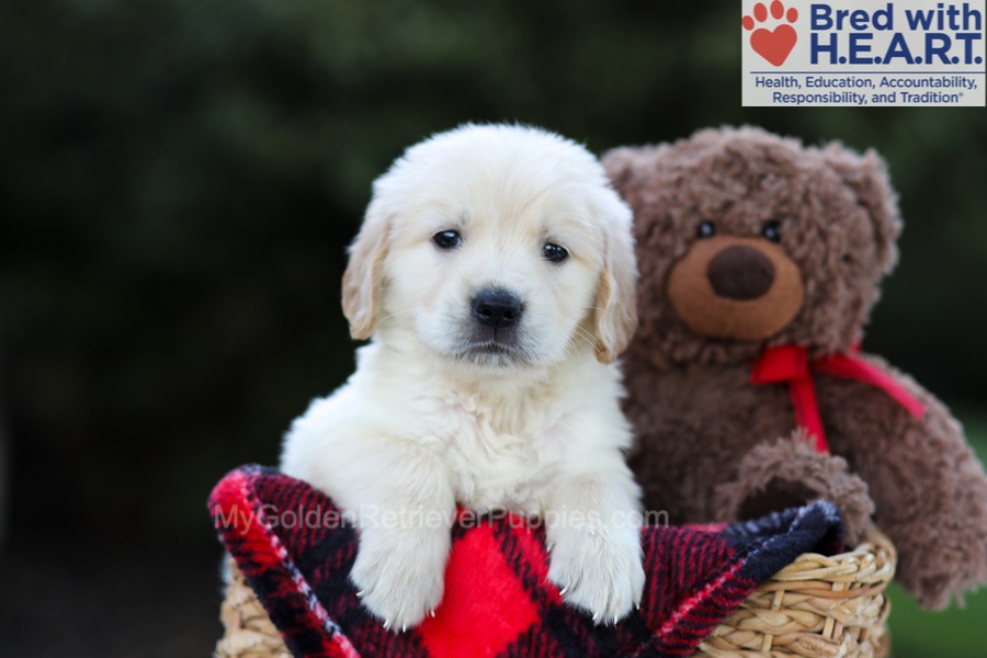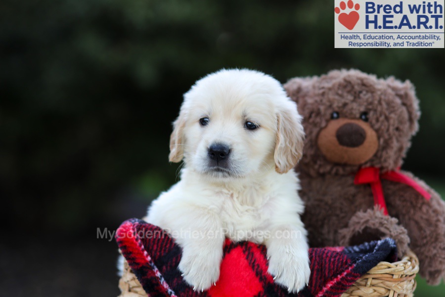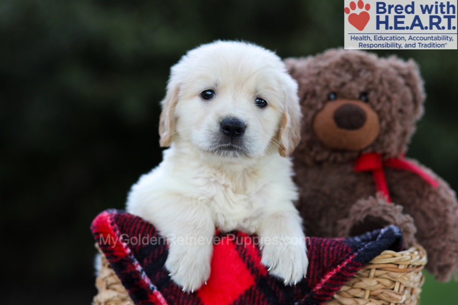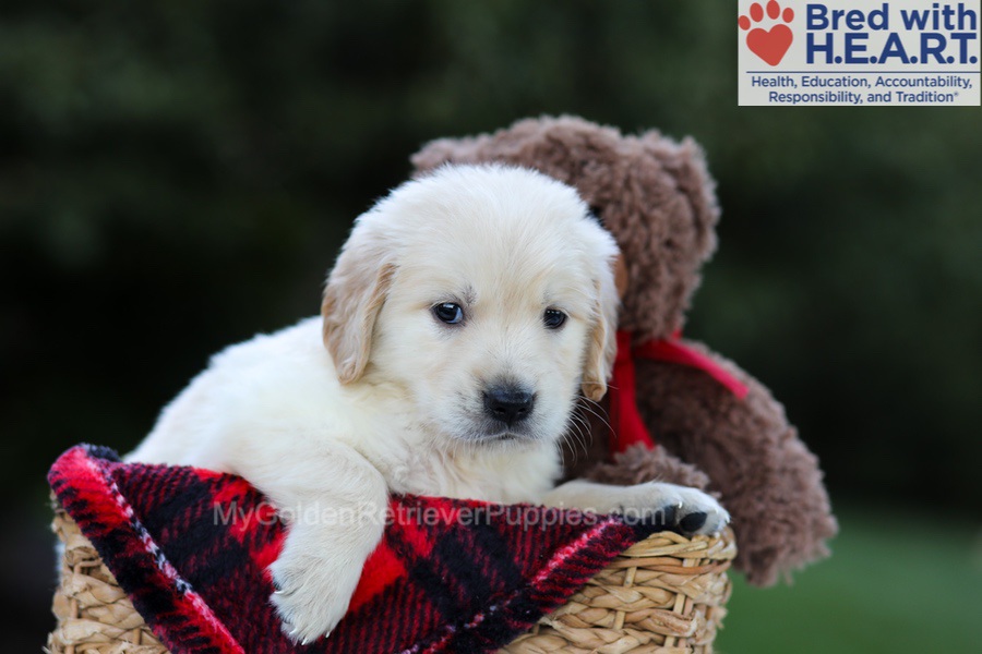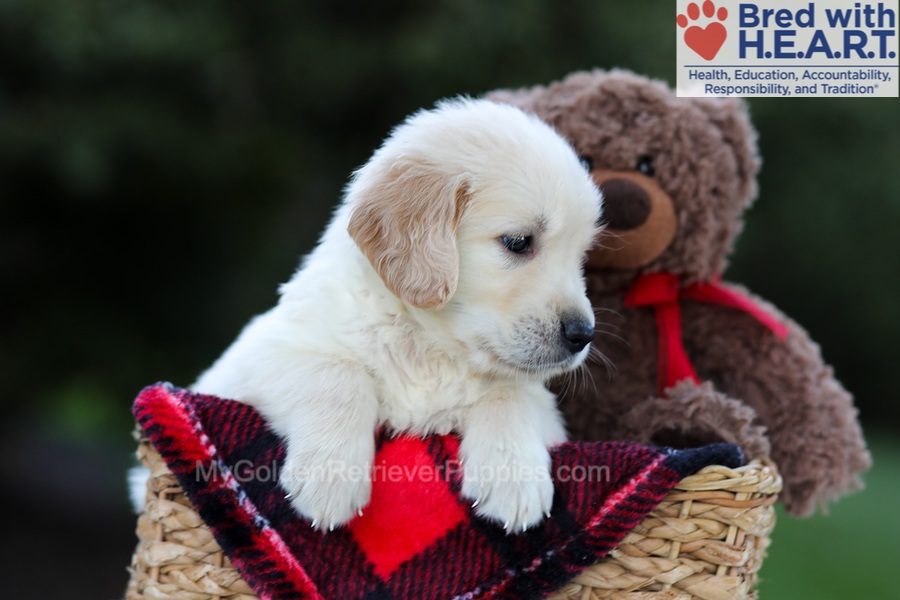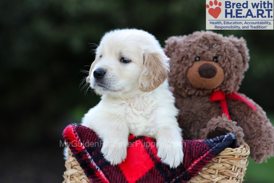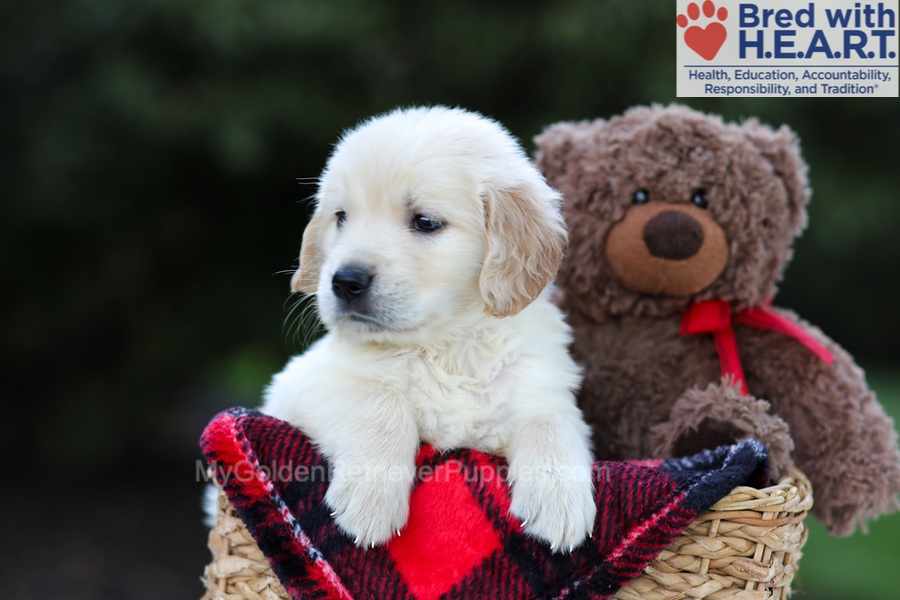 My sire Montae is a poised dark Golden who is OFA Hip, Elbow, Patella and Heart certified.. My mother Rainelle is a lovely medium golden who is OFA Hip, Elbow, Patella and Heart certified. Both of my parents are on site and have been genetically health tested. I was raised with care in our loving family environment and has been ENS stimulated from day 3-16.