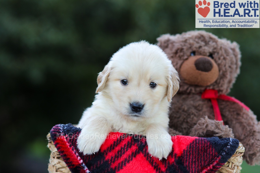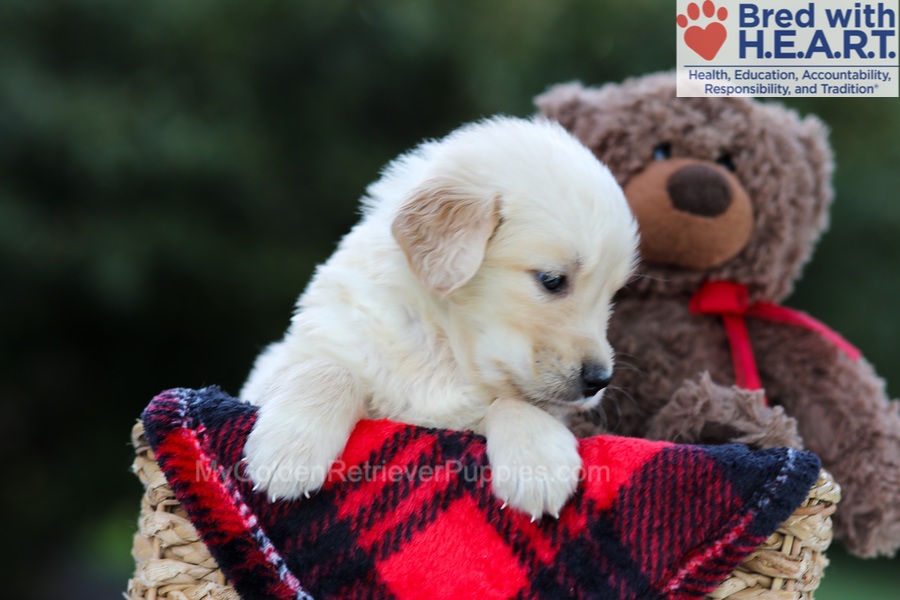 My sire Montae is a poised dark Golden who is OFA Hip, Elbow, Patella and Heart certified.. My mother Rainelle is a lovely medium golden who is OFA Hip, Elbow, Patella and Heart certified. Both of my parents are on site and have been genetically health tested. I was raised with care in our loving family environment and has been ENS stimulated from day 3-16.