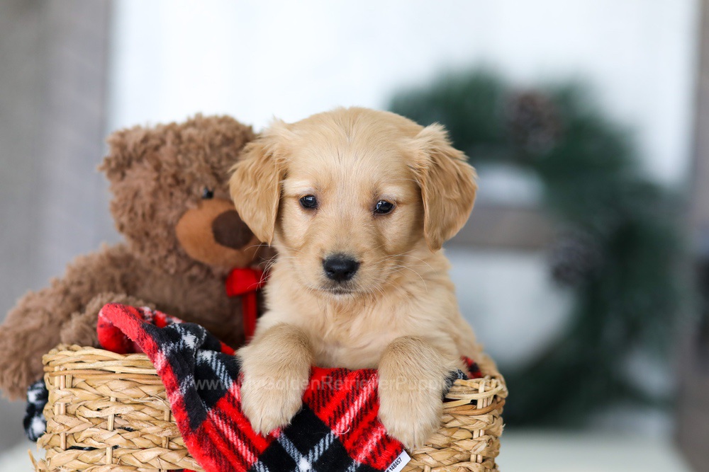 My sire Zeus is a beautiful medium colored golden, OFA Hip, Elbow, Heart, Patella, and Eye certified, and is genetically screened and clear. My mother Gabby is a beautiful light golden with a friendly personality who is also OFA Hip (prelim), Elbow (prelim) and Eye certified and also genetically screened and clear. Both of my parents are here on the premises.