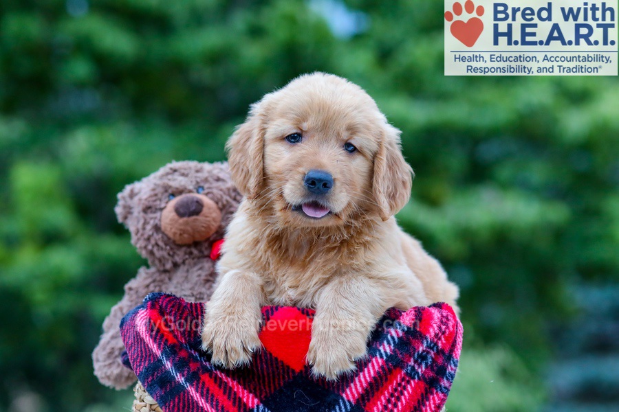 My sire Cody is a beautiful dark golden-red color who has his OFA Hip (prelim), Elbow (prelim), Heart and Patella certifications . My mother Daisy is a loving and gentle dark golden who is also OFA hip, elbow, hear and patella certified. Both of my parents are also genetically health-tested and are here on the premises for you to meet!