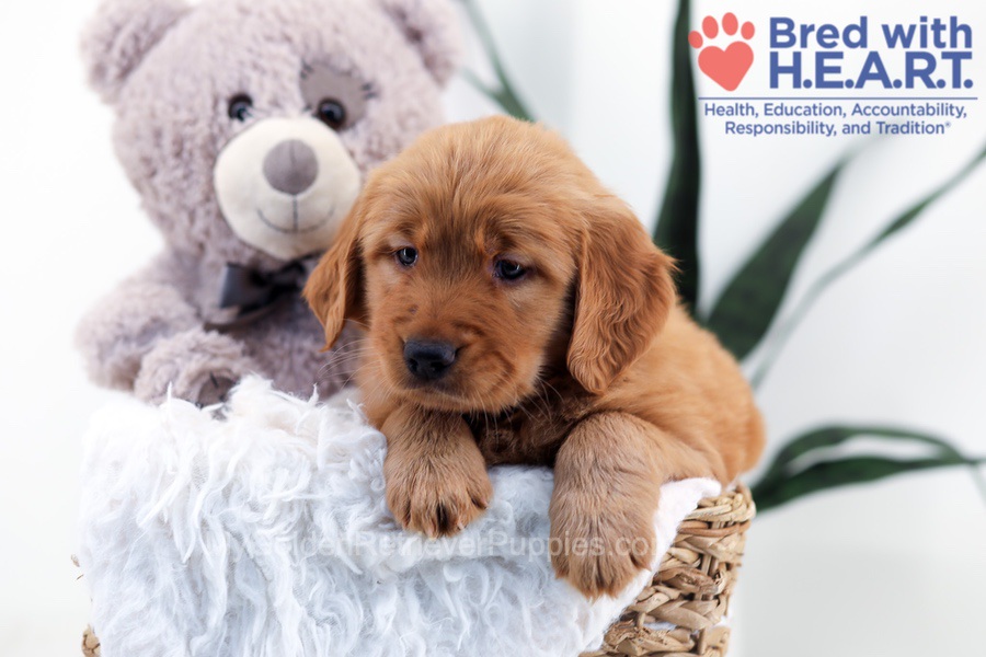 My sire Montae is a poised dark Golden with OFA Hip, Elbow, Patella and Heart certifications and my mother Bella is a medium golden color with a loyal, sweet personality who is also OFA Hip, Elbow, Heart and Patella certified. Both of my parents are also DNA health-tested and are here on the premises.
