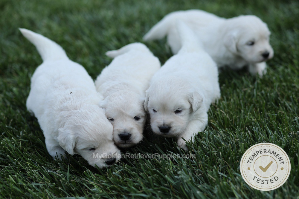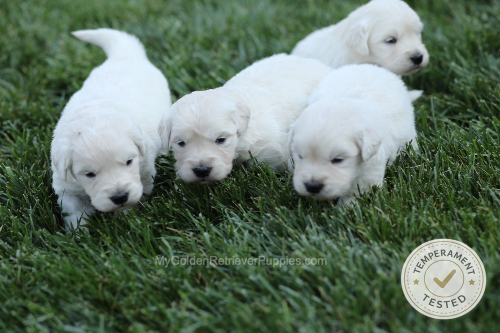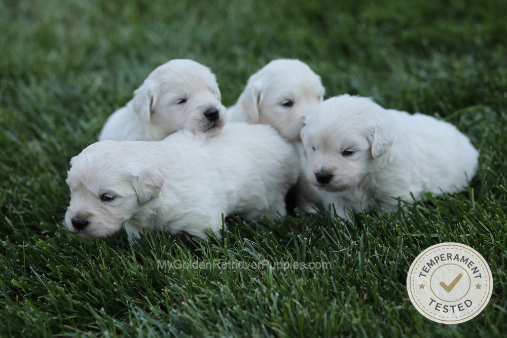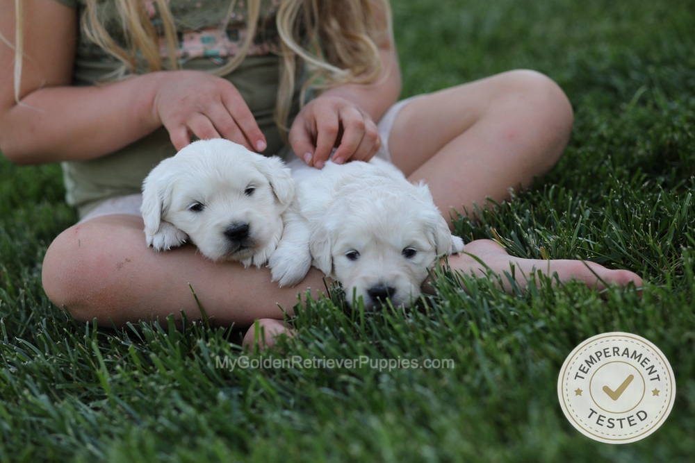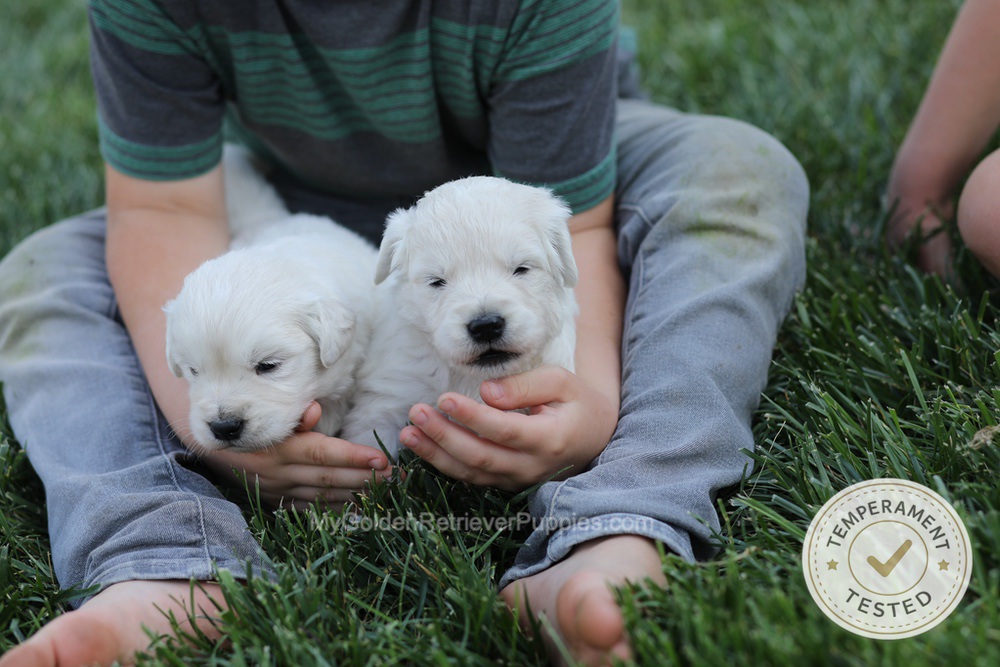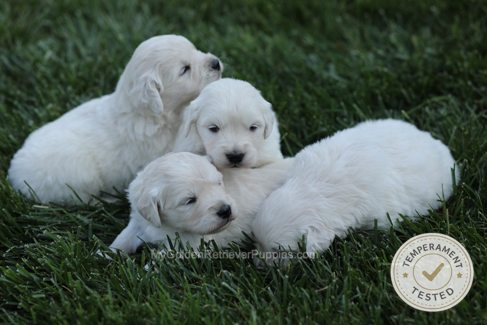 The sire Winston is a majestic cream who is PennHip and OFA Elbow, Heart and Patella certified. The mother Heidi is OFA hip, elbow, heart and patella certified. Both parents have great Golden personalities and are genetically health-tested.