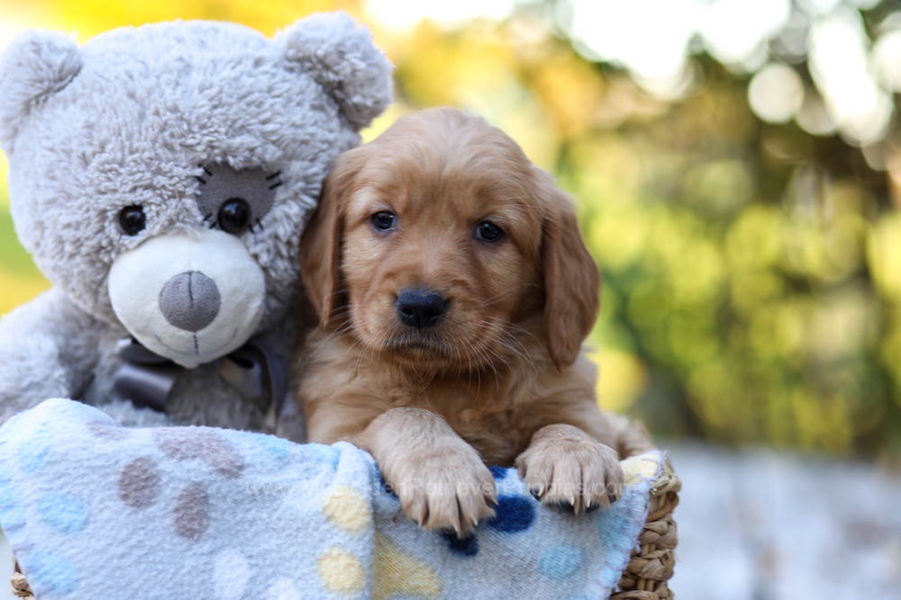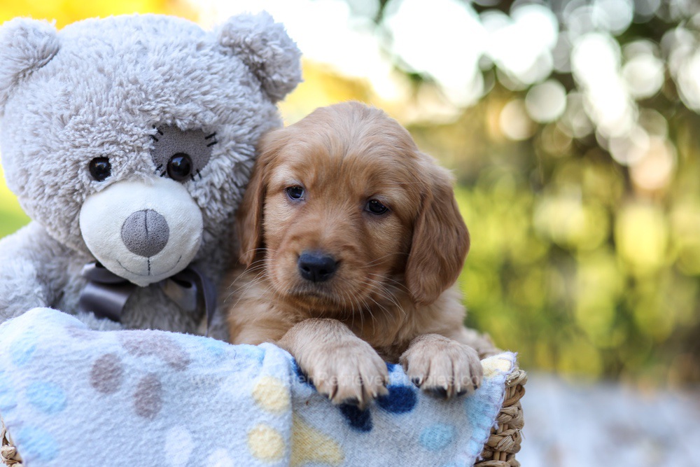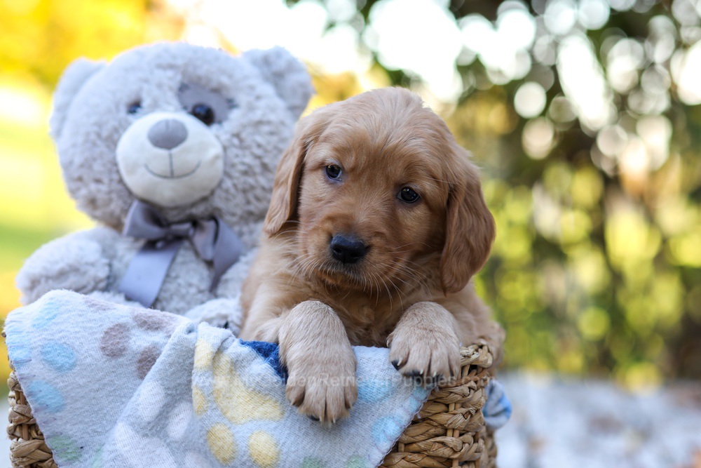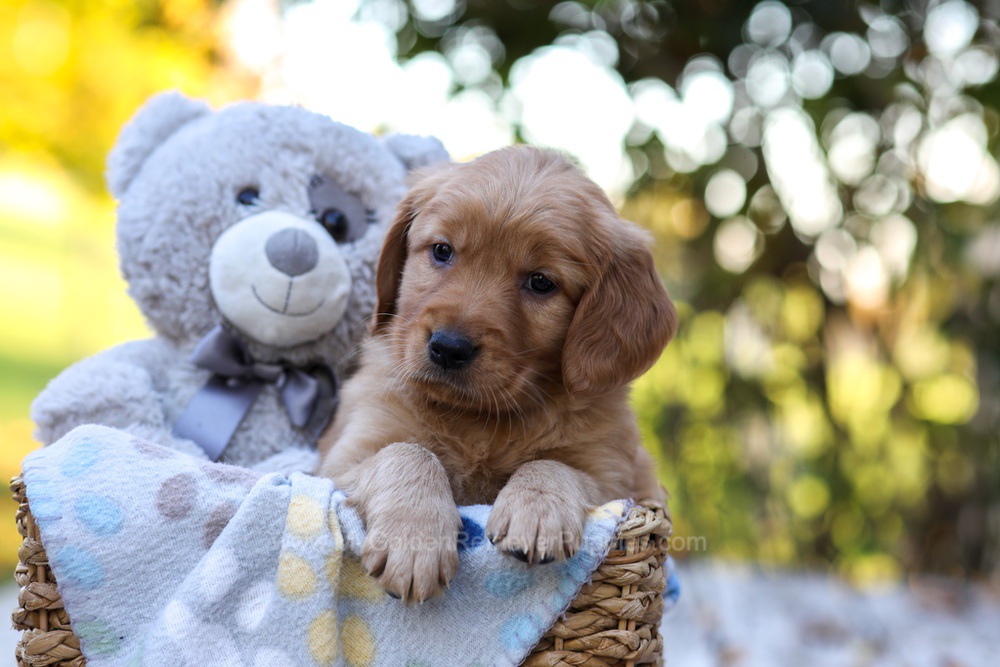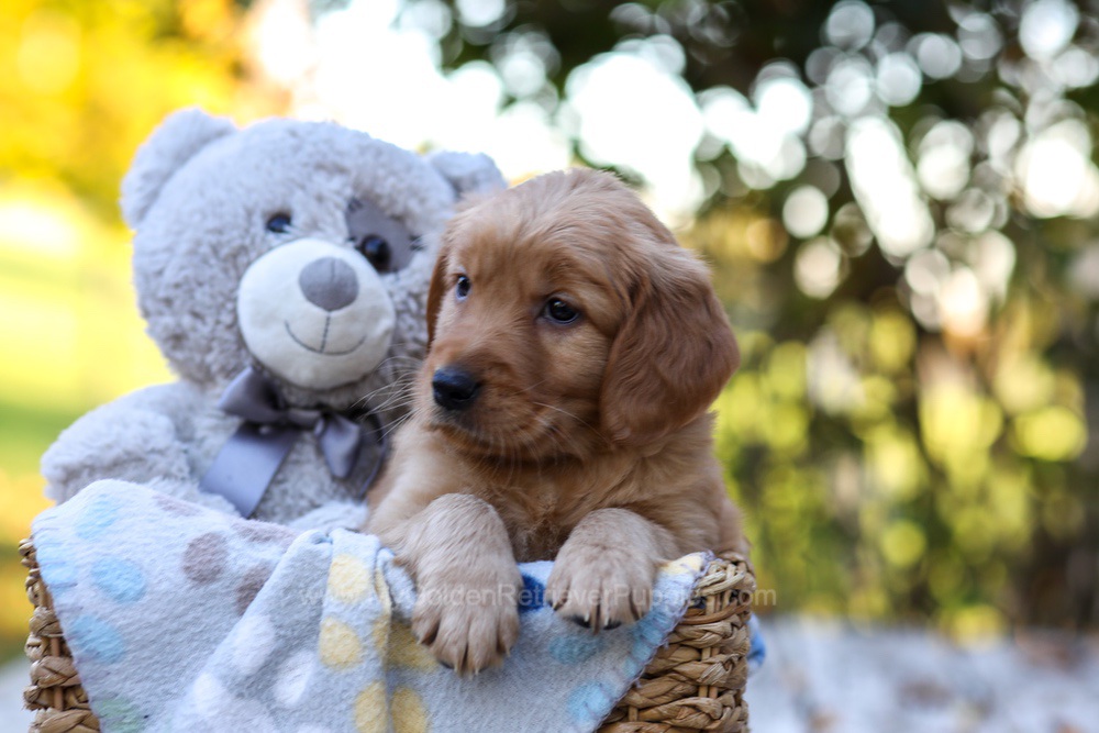 The sire Moses is a beautiful blocky-headed dark Golden who is OFA Hip, Elbow, Heart and Patella certified. My mother River is a gorgeous copper golden with a warm personality who is OFA Hip, Elbow, Heart, Patella and Eye certified. Both parents are DNA health-tested and are on the premises.