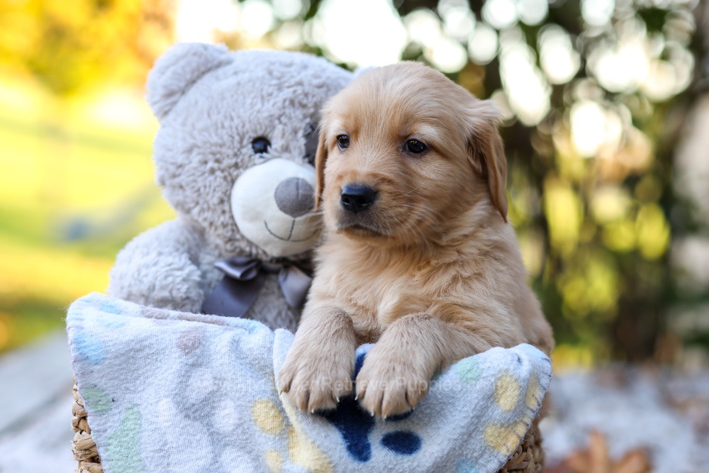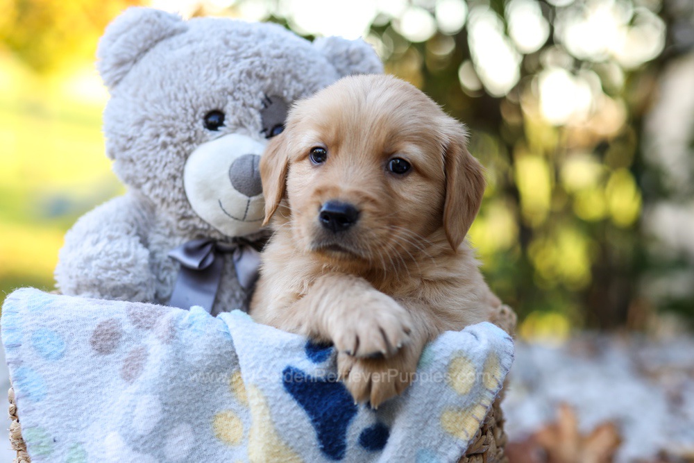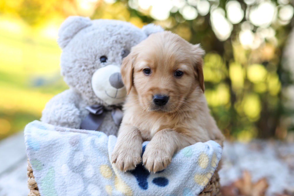 The sire Moses is a beautiful blocky-headed dark Golden who is OFA Hip, Elbow, Heart and Patella certified. My mother River is a gorgeous copper golden with a warm personality who is OFA Hip, Elbow, Heart, Patella and Eye certified. Both parents are DNA health-tested and are on the premises.