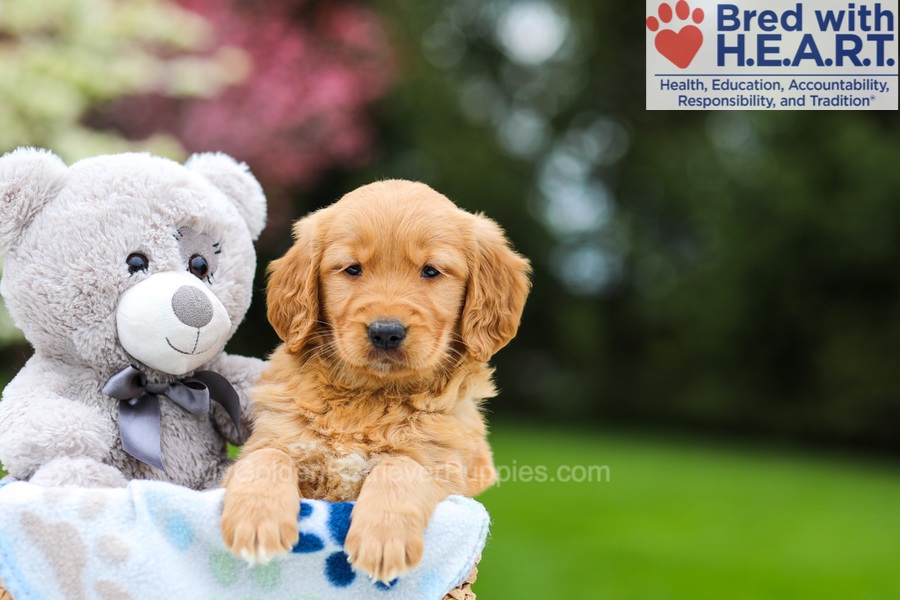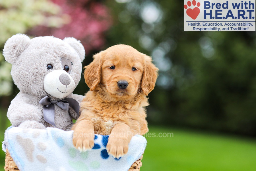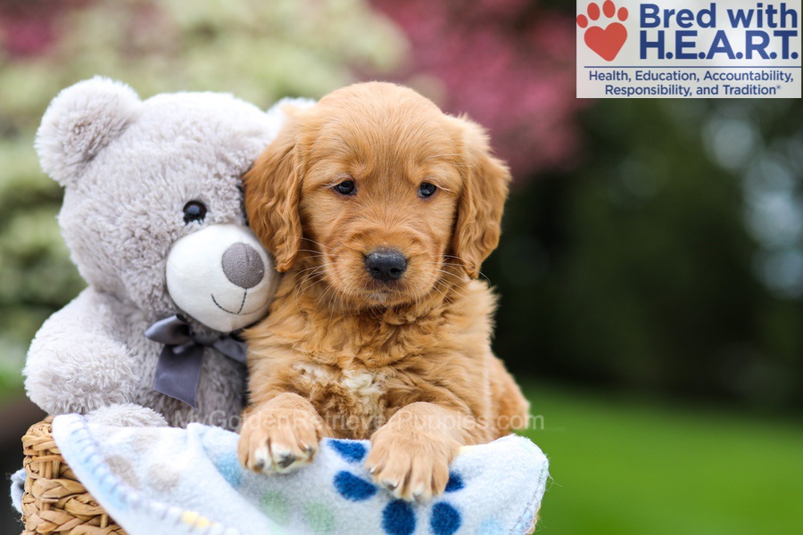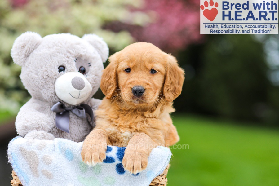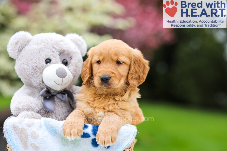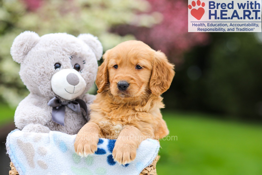 My sire Mooz is a handsome dark golden who is OFA Hip, Elbow and Heart certified. My mother Rainelle is a lovely medium golden who is OFA Hip, Elbow, Patella and Heart certified. Both of my parents are on site and have been genetically health tested. I was raised with care in our loving family environment and has been ENS stimulated from day 3-16.